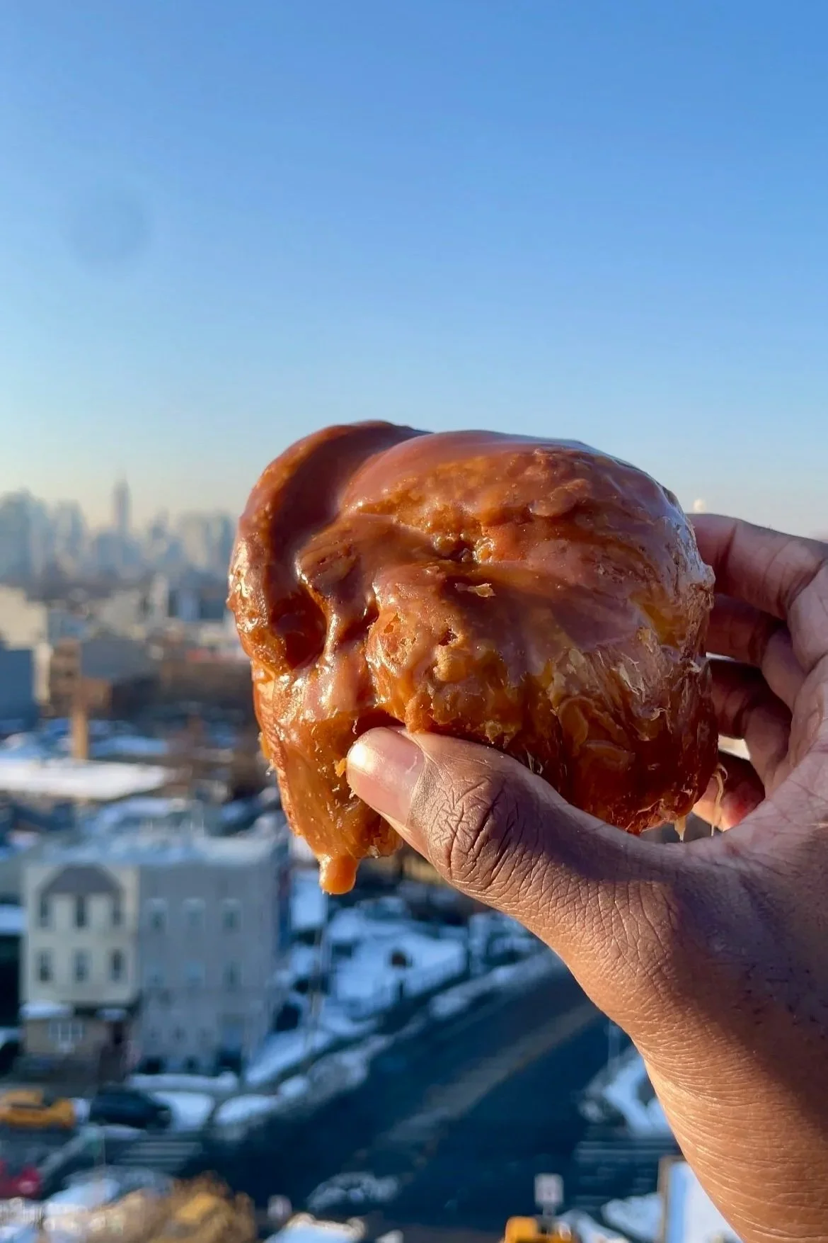 A light and fluffy bun, filled with cardamom pastry cream and covered in sticky toffee.