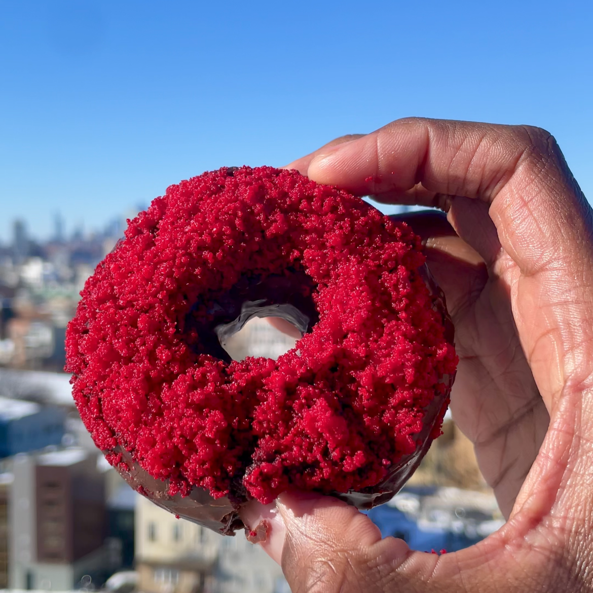 Rich chocolate cake doughnut dipped in Valrhona chocolate, with a chocolate pudding filling and finished with red velvet crumbs for Valentine’s Day.