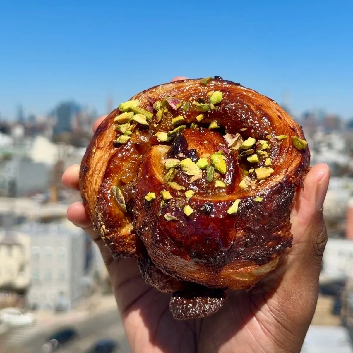 A roll made of buttery, soft laminated dough, stuffed with stewed cherries and topped with crumbled pistachios.