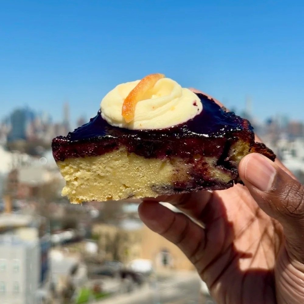 Moist corn cake topped with berry compote, light cream cheese frosting, and a hint of citrus.